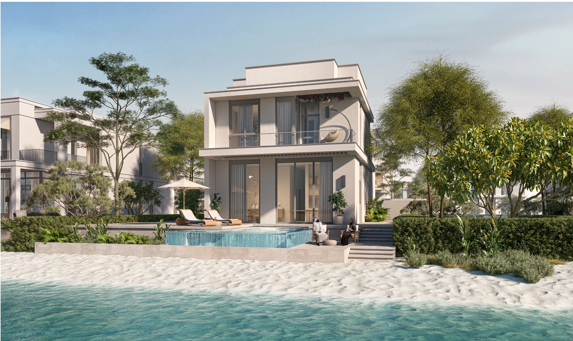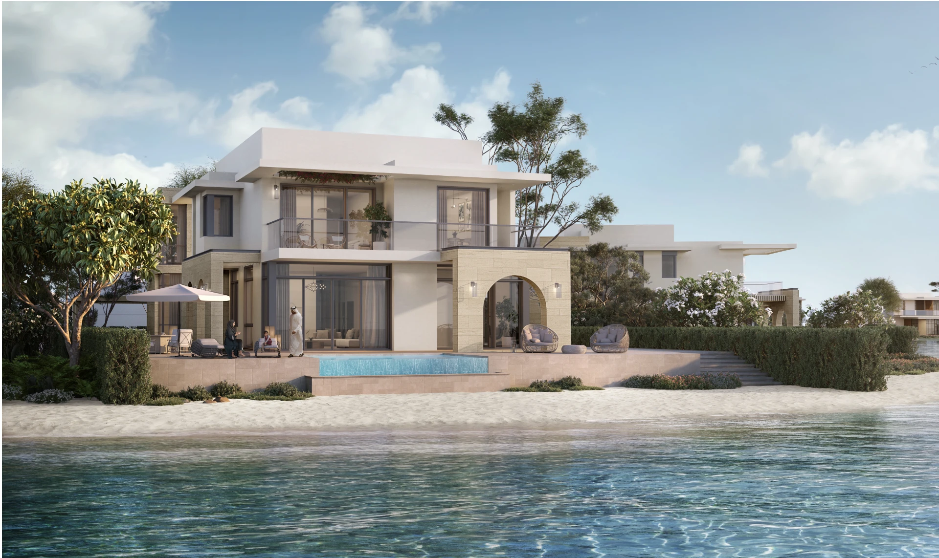 Sky is the largest and most prestigious villa collection at Ramhan Island. At 700 square metres of built-up area on plots of up to 1,430 square metres, Sky villas are island estates — designed to the specification of a private resort. The roof terrace offers 360-degree island and Gulf views, the master suite occupies the entire upper-floor wing, and the ground floor with a private club.