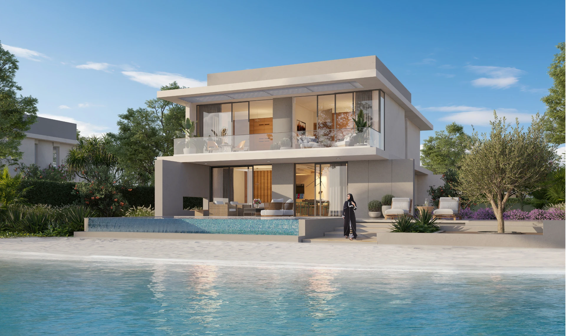 The result is a residential community that feels genuinely removed from city life while remaining practically connected to it. A dedicated bridge to the Abu Dhabi mainland is currently under construction. In the interim, a 10-minute ferry connects residents to the mainland jetty.