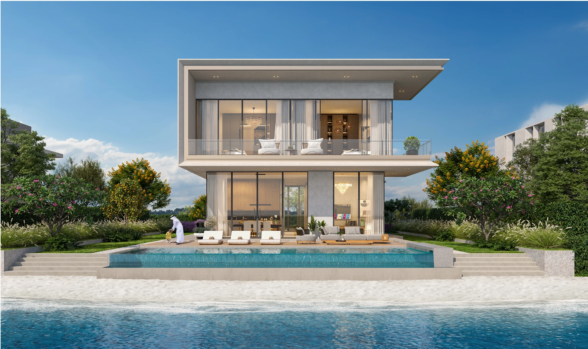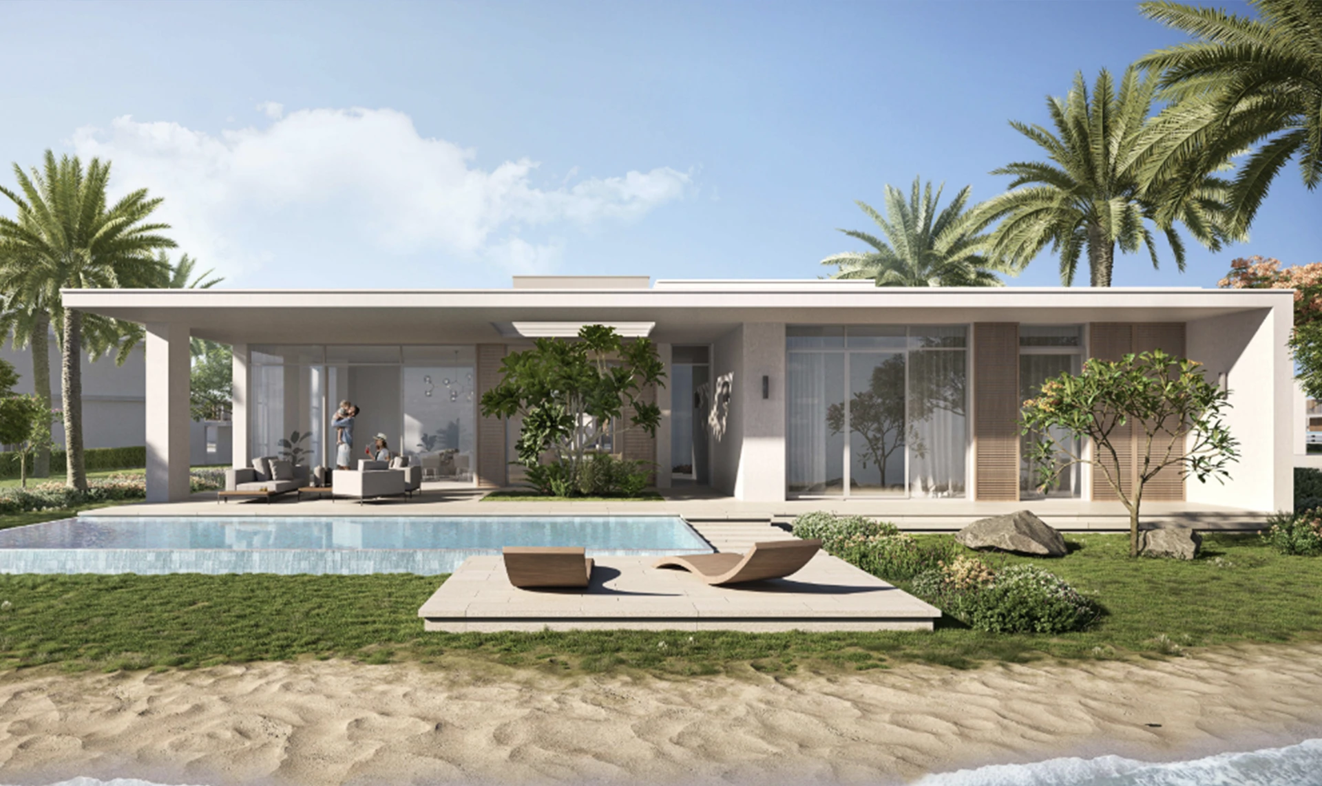 Grace is designed for families who want generous living space without the scale of the larger villa collections. The layout prioritises a chef's kitchen, a dedicated family room separate from the formal living area, and a landscaped rear garden designed around the private pool. Floor-to-ceiling glazing on the rear facade maximises natural light and frames the water or garden view from every principal room.